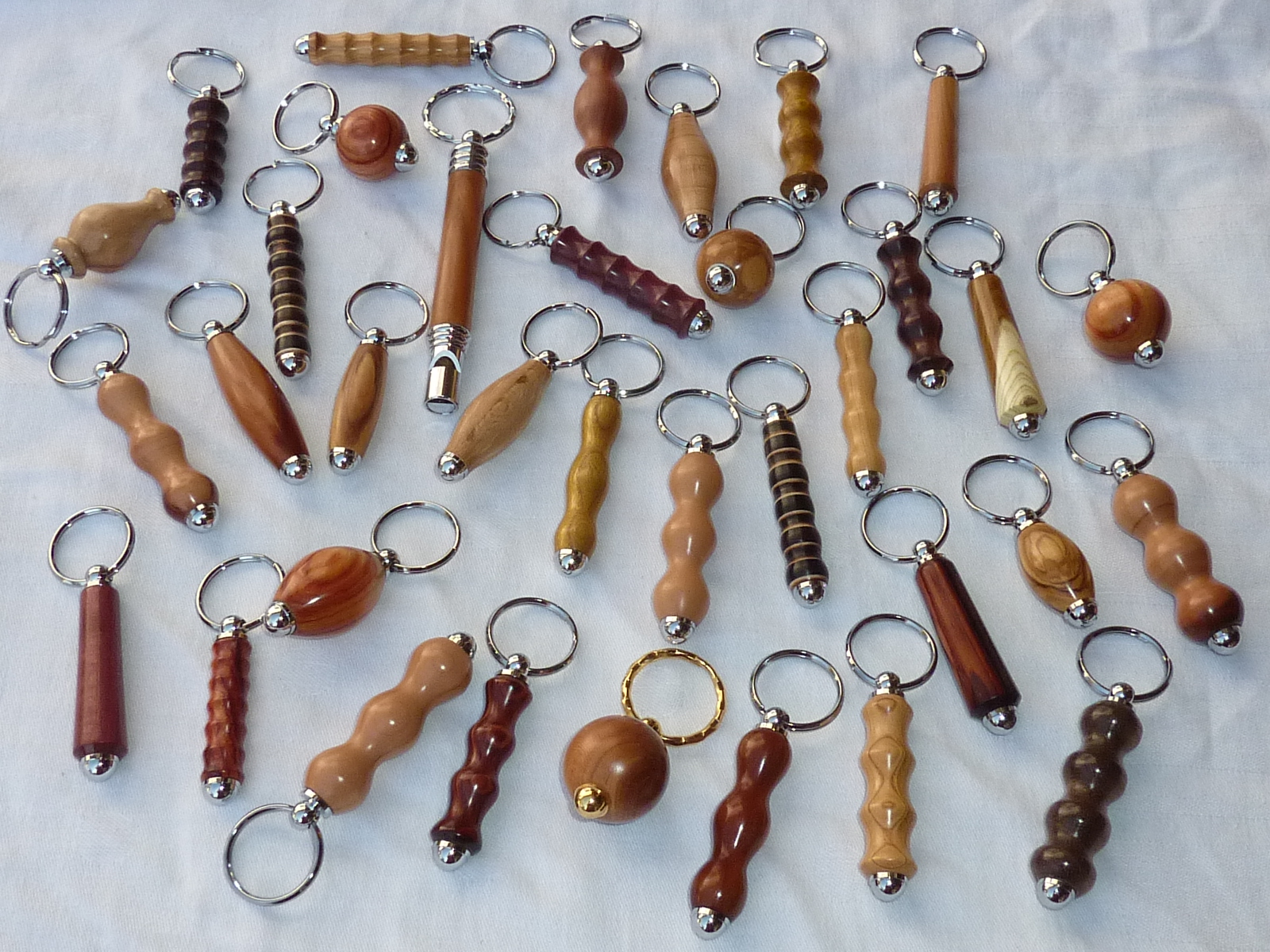 Hier gibt es seitens Formgebung und Holzart ebenfalls kaum Grenzen, es gibt die Schlüsselanhänger in ganz einfacher Ausführung oder mit "Geheimfach" zum Aufschrauben (für Notizzettel, Geldnote, Tabletten, Zahnstocher usw.) oder sogar mit Pfeife und inkludiertem Geheimfach. Für Gasthäuser, Hotels oder Ferienwohnungen können auch ganze Serien an Schlüsselanhängern mit Zimmernummern angefertigt werden. Diese Schlüsselanhänger sind handlich, leicht, trotzdem robust und nicht so schwer und unpraktisch wie Anhänger aus Messing. Zudem kann die Holzart individuell gewählt werden. Eines der nachfolgenden Bilder zeigt eine Serie in Olivenholz.